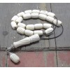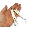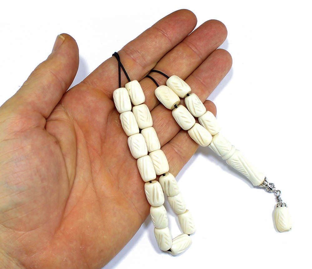 Greek Komboloi with barrel shape beads made of natural hand engraved, Camel bone . 21 handy beads and matching head piece. White natural color with artistic engraved details. Symmetrical cut and antique finished sterling silver 925° parts. Custom, hand made, tassel with bone bead decoration. An elegant and durable komboloi for daily use made of a strong natural material.