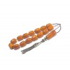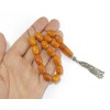 Pocket size komboloi set, made of dark Yellow natural amber, pressed, with darker and lighter shades of Brown. Οn the surface of the beads, all the Original Material characteristics of the rough amber, such as marks, skin parts, are to be seen, giving to the set, a unique natural character. A unique oval shaped, natural amber beads and head piece and separators.Sterling silver parts decorated, hand made tassel. A small but elegant set for gently use and with a unique "rough material" look .